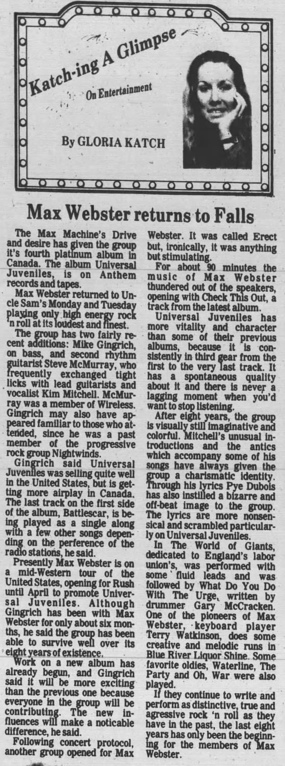 Back in the early eighties, Max Webster was playing at a bar on Lundy's Lane in Niagara Falls, (Uncle Sam's, I think) while the bar next door had Universal Juveniles on their stage. Universal Juveniles was a Max Webster tribute band. Between sets, the members of Max Webster went over and joined the Juveniles for a few songs.