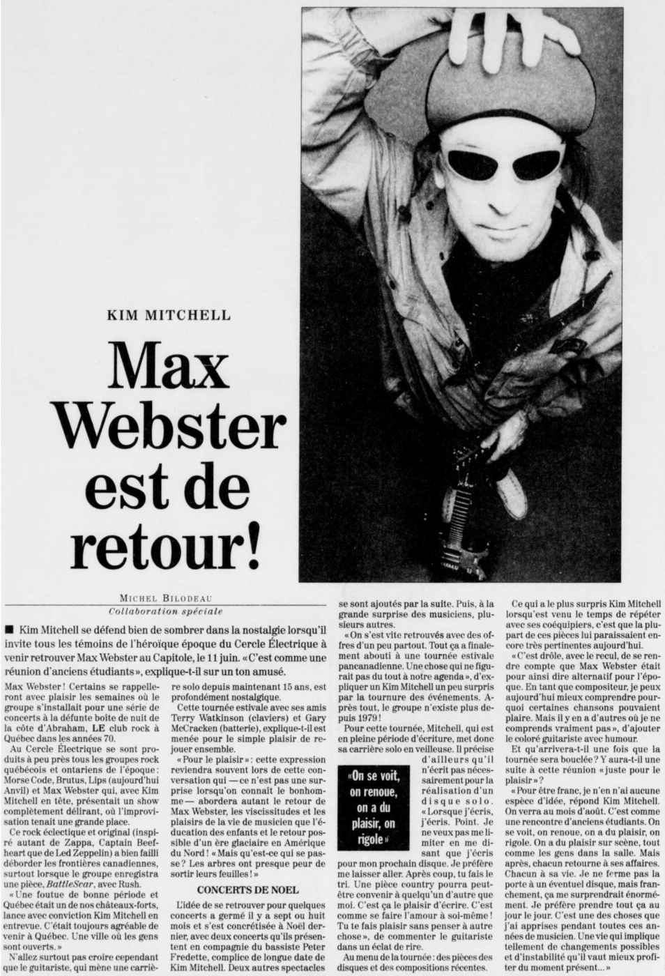 Kim Mitchell is careful not to indulge in nostalgia when he invites all those who witnessed the heroic days of the Electric Circle to come and meet Max Webster at the Capitol on June 11. "It's like a high school reunion," he explains with amusement.