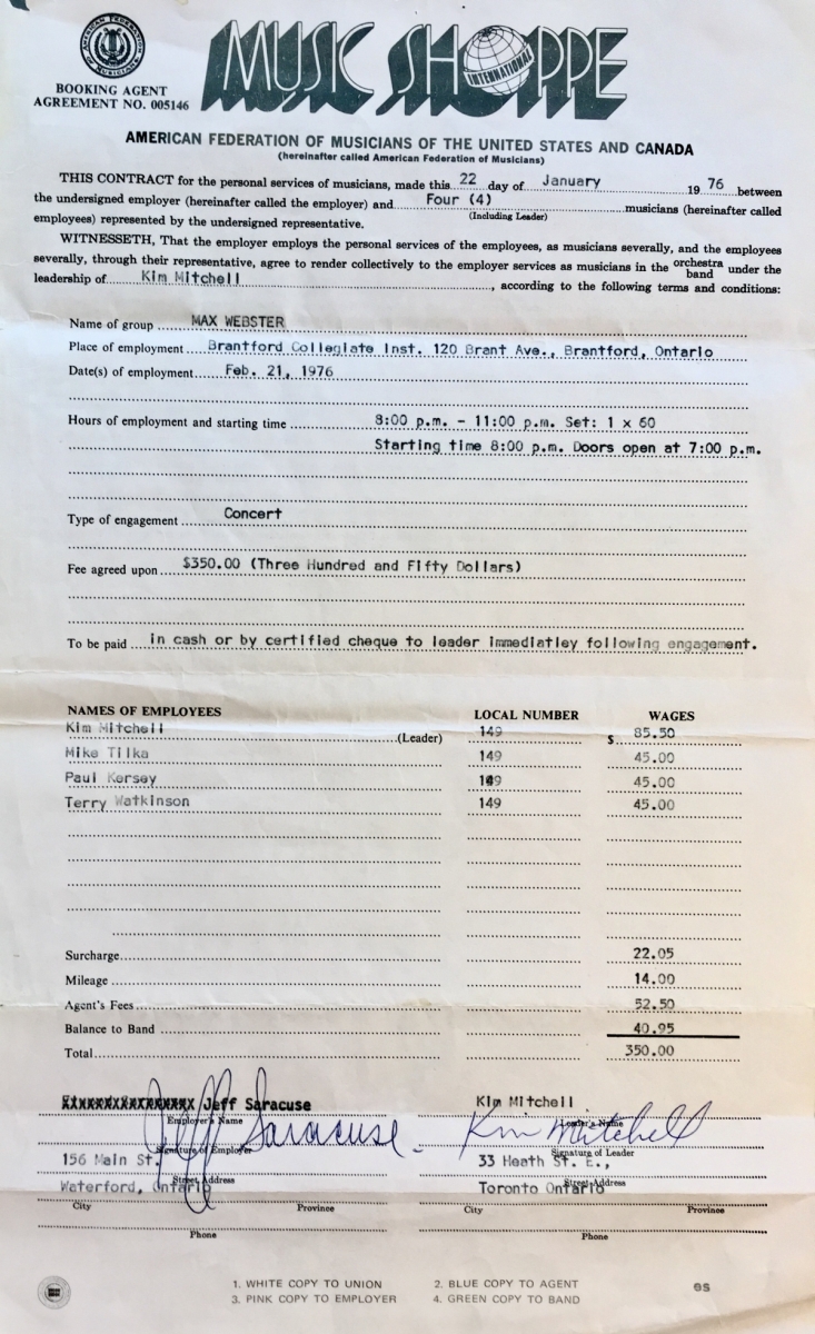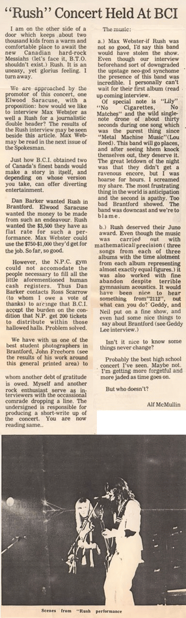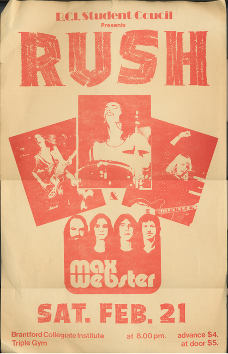 "Since I was an agent for Music Shoppe International who represented Max Webster, it was a conflict of interest for me to also be the promoter, so I got my brother Jeffrey to sign the contract. Also, to get a favourable rental price of $600 on the gym I made deal with the BCI Student Council to list them as the presenter on the advertising instead of Elwood Saracuse Productions. After the show the band loaded up their truck and accidentally drove across the football field, which left some big ruts that had to be repaired."