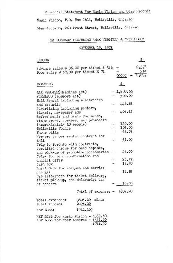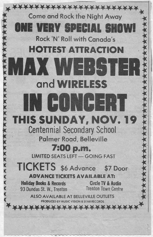 Stuart Roberts recalls: "Punk kid fresh out of college, working at a record store, decided to do a concert...and one hundred people short of breaking even. Max Webster. And I remember Jeff Keys and I bitchin' we had to hire Wireless cuz they were the package deal. Wireless were okay but we wanted to use Creed at the time and not allowed."