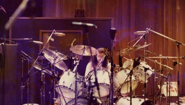 Photo taken at Phase One during these sessions. Note that Gary McCracken's kit isn't with "concert toms" as he used live on his Slingerland and Milestone kits, but instead double headed toms.
