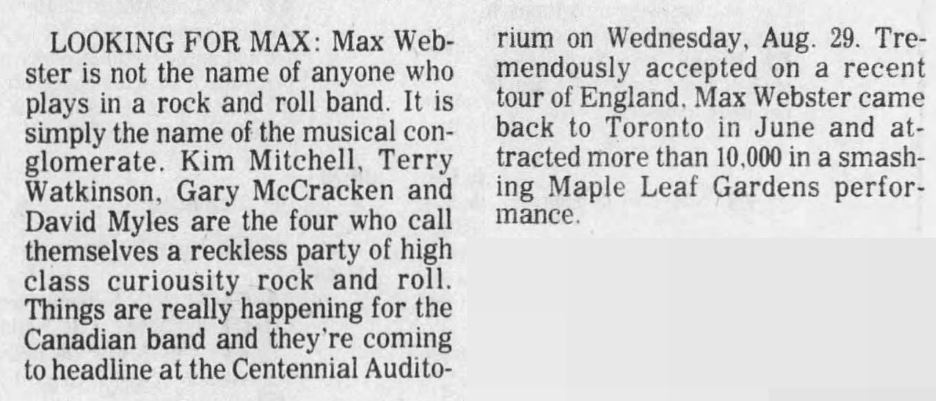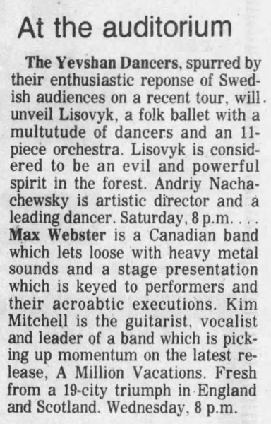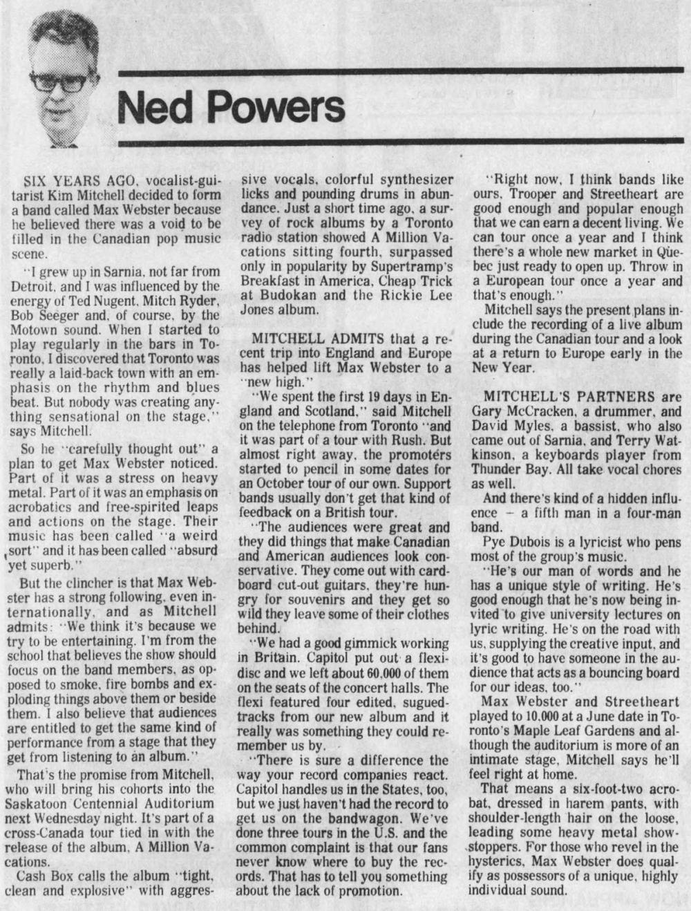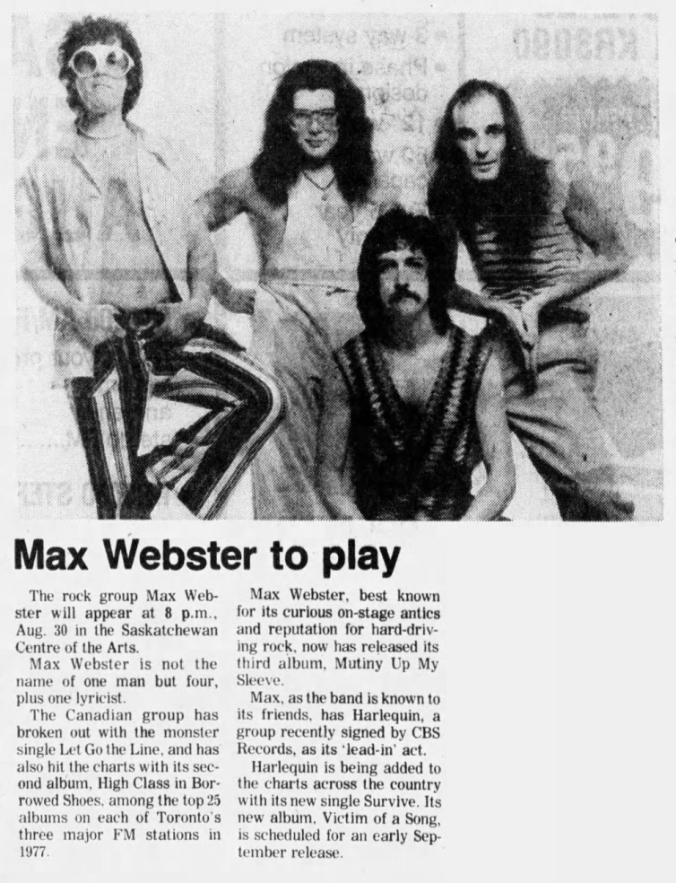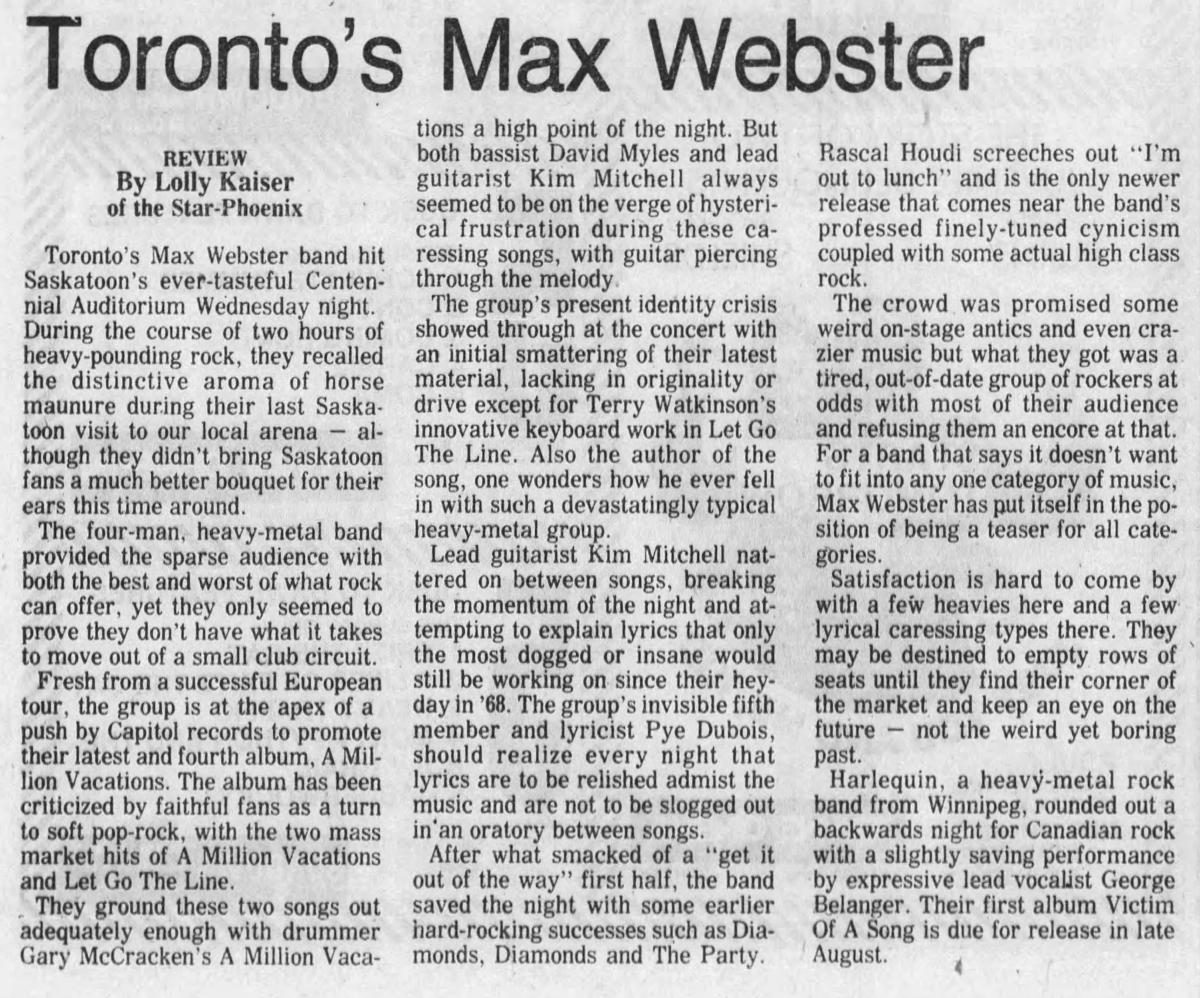 Supporting Harlequin on the "A Million Vacations" Tour Line-up Kim Mitchell : Vocals/Guitar Terry Watkinson : Keyboards Gary McCracken : Drums Dave Myles : Bass Bands Harlequin Partial Setlist A Million Vacations Let Go The Line Rascal Houdi Diamonds Diamonds The Party Hangover Ads and Posters Articles