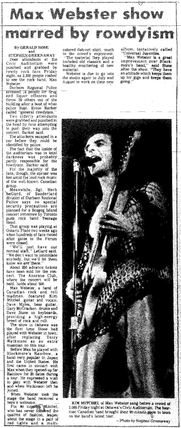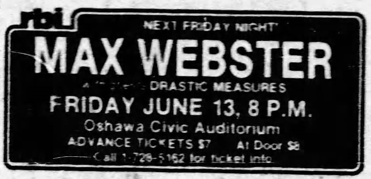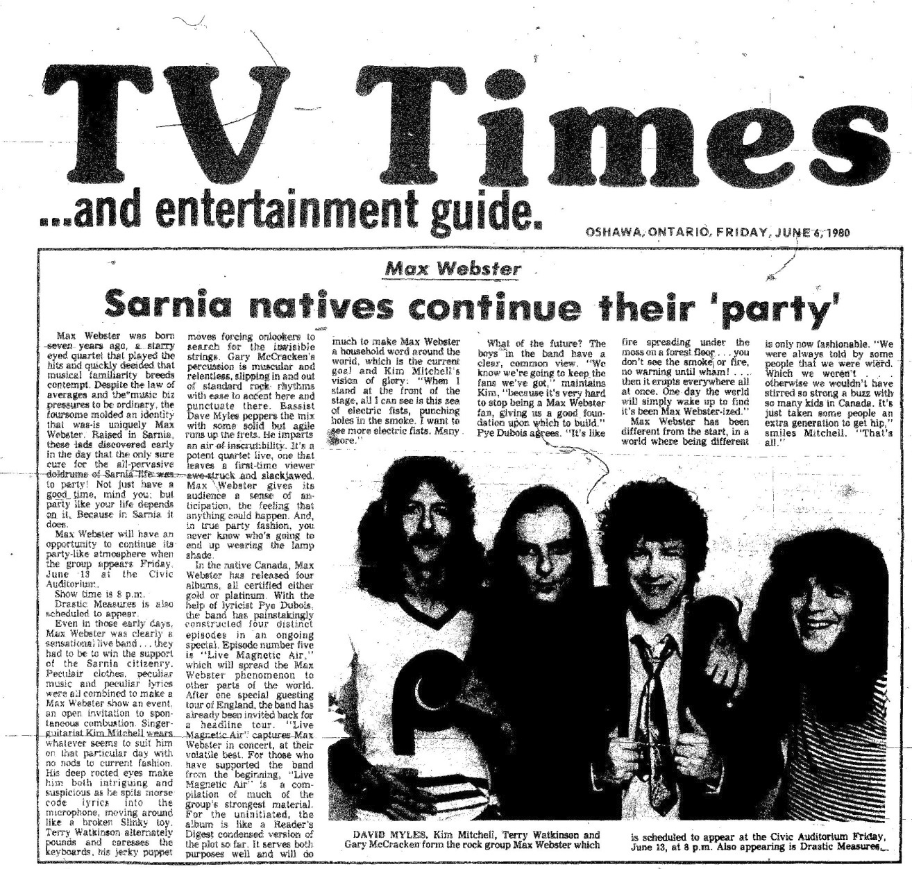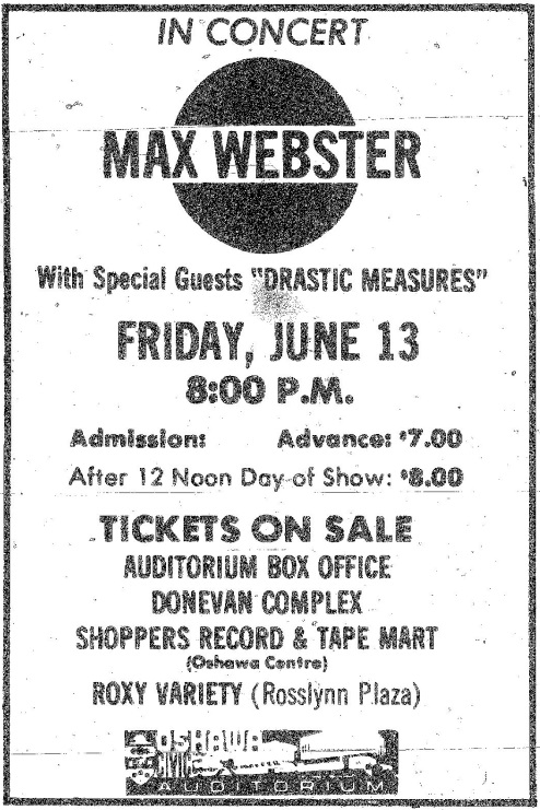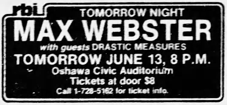 Line-up Kim Mitchell : Vocals/Guitar Gary McCracken : Drums Dave Myles : Bass Dave Stone : Keyboards Bands Max Webster is headliner Drastic Measures Photos Photos © Stephen Greenaway. Ads and Posters Articles