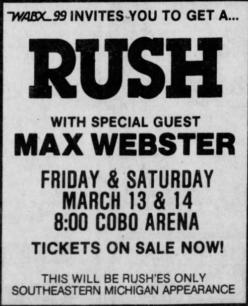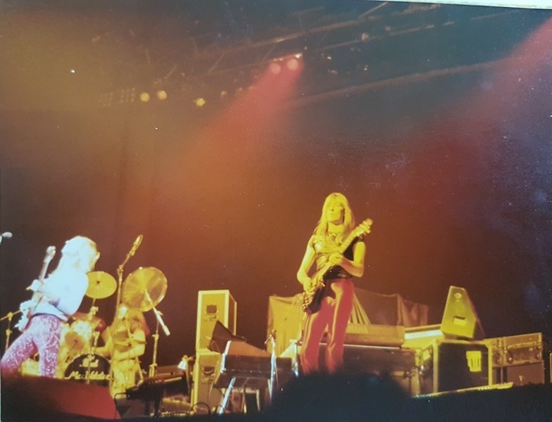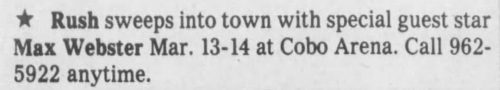 Geddy Lee once again joined Max Webster for Battle Scar, this time with his hair tucked under one of those beer can hats from the '70s. He took the hat off and his hair fell down, and the audience erupted.