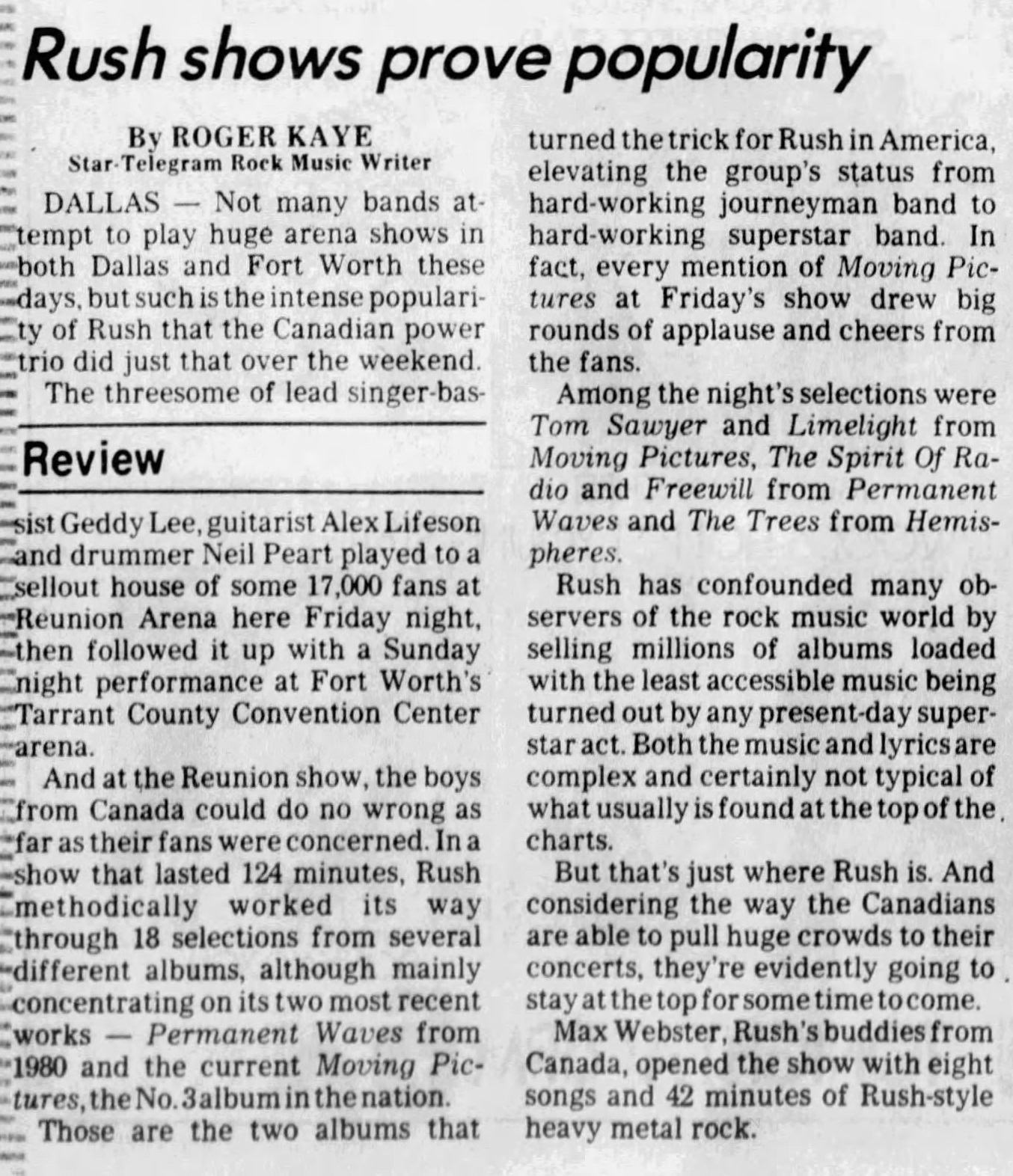 Supporting Rush on the "Moving Pictures" Tour Line-up Kim Mitchell : Vocals/Guitar Gary McCracken : Drums Terry Watkinson : Keyboards Mike Gingrich : Bass Steve McMurray : Guitar Bands Rush Tickets Articles