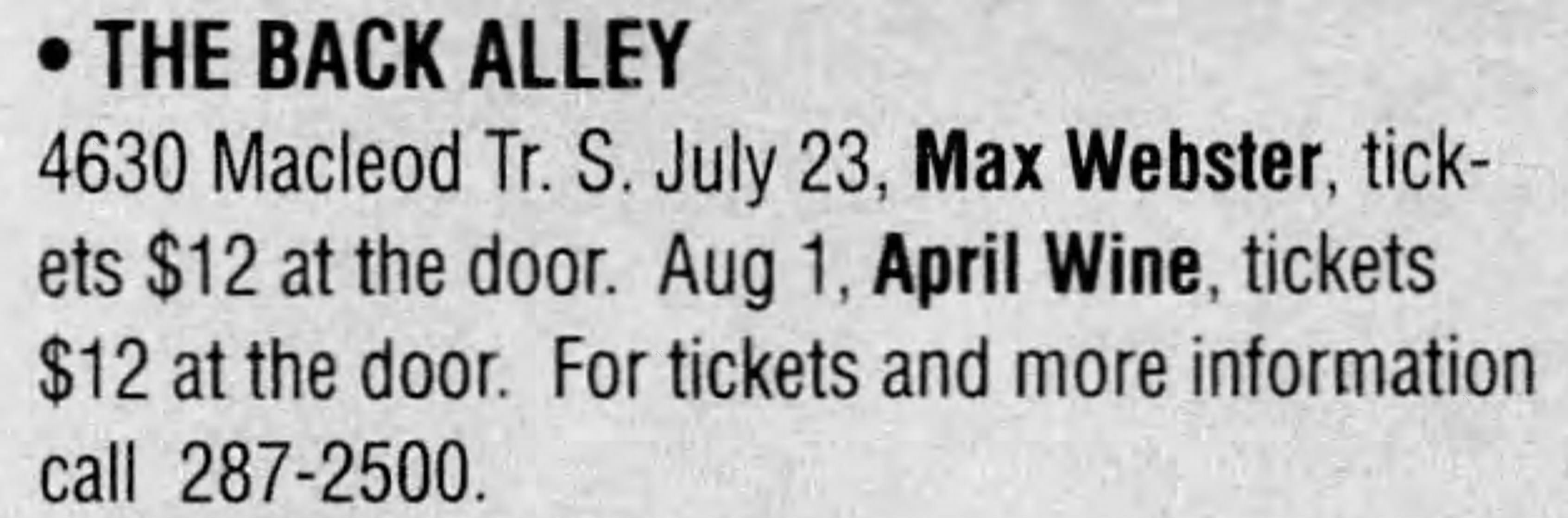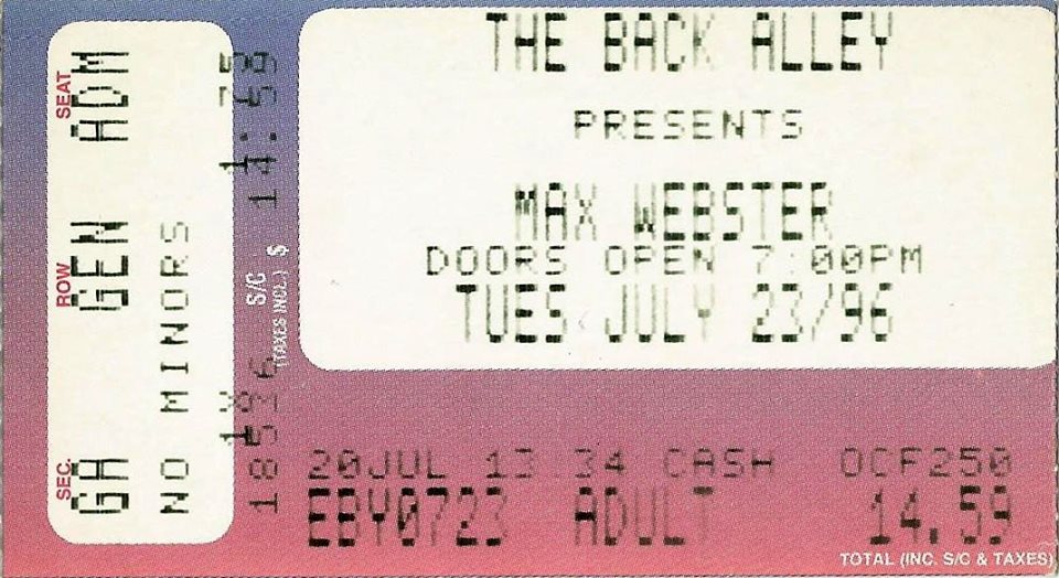 1996 rolls around and Max Webster did a brief cross Canada Reunion Tour and I was lucky enough to get tickets for The Back Alley in Calgary and it was MY TENTH!!! So as the concert progresses... girlfriend long lost I found myself up at the front of the stage yelling DO SOME KIM MITCHELL DO SOME KIM MITCHELL!!! He looks at me and says — right into the microphone "you fucking KILL me, man."